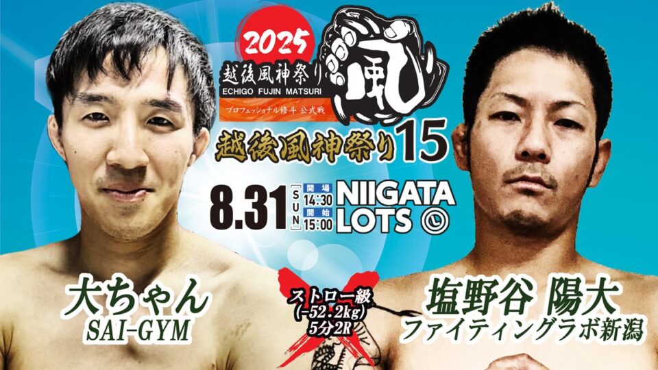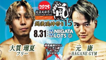 ※越後風神MMAルールに出場を予定しておりました元康選手(HAGANEGYM)は、練習中の負傷(眼窩底骨折)により、医師の判断で今大会を欠場することになりました。これに伴い、代替選手として渡邉陽大(ブレイブハート)の参戦が決定いたしました。本試合は、越後風神MMA62kg契約5分2Rにて実施されます。