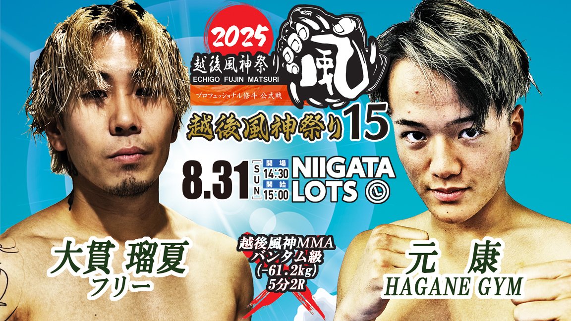 2025/08/19越後風神MMAルールに出場を予定しておりました元康選手(HAGANEGYM)は、練習中の負傷(眼窩底骨折)により、医師の判断で今大会を欠場することになりました。