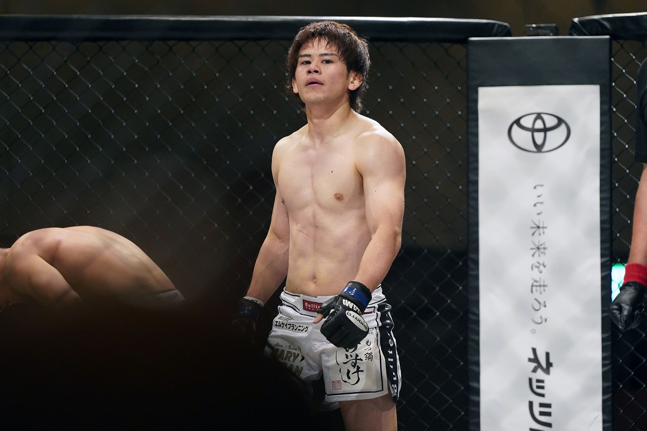 おえゆうた選手は、久々の修斗参戦。フェザー級、ライト級と、対戦相手に合わせて階級を変えているが、本来は、フェザー級くらいが適性と思われる。オーソドックスで、かなり遠間からカーフ、ミドル、詰めてワンツーを繰り出すストライカータイプだが、組まれてもケージ際のディフェンスが手堅く、またグラウンドでも柔軟に対応する。料理がうまい。